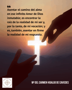 Con este objetivo comenzamos a compartir el carisma de un modo formativo. Partiendo de la llamada universal a la vida como creaturas de Dios, iremos profundizando, poco a poco, ayudándonos sobre todo de los textos de los fundadores. De ellos hablaremos como Madre Fundadora y Padre Fundador, o bien con sus nombres. Pondremos sus palabras como dirigidas a todas las almas oblatas, entendiendo con esa expresión a toda alma que quiere unirse a la oblación de Cristo pro eis et pro Ecclesia. Por ello, cuando ellos dicen “hijas mías”, pondremos “hijos míos”, pues desde el cielo seguro que ejercen su paternidad sobre todas las almas oblatas. Y trataremos de escoger todo lo que de algún modo se pueda proyectar en cualquier tipo de vida cristiana, sea cual sea su estado. El Espíritu Santo se